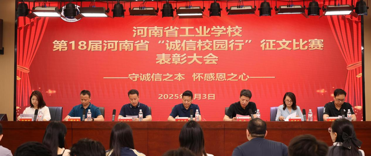 2025年6月3日下午,我校第18屆河南省“誠信校園行”征文比賽表彰大會在實訓中心二樓報告廳隆重舉行。校黨委書記、校長劉寶亮出席會議并講話,學生科科長陳俊清、各系部書記及獲獎師生代表參加會議,校黨委副書記鄧全主持會議。會后,劉寶亮給參會師生上了一堂生動的思政課。